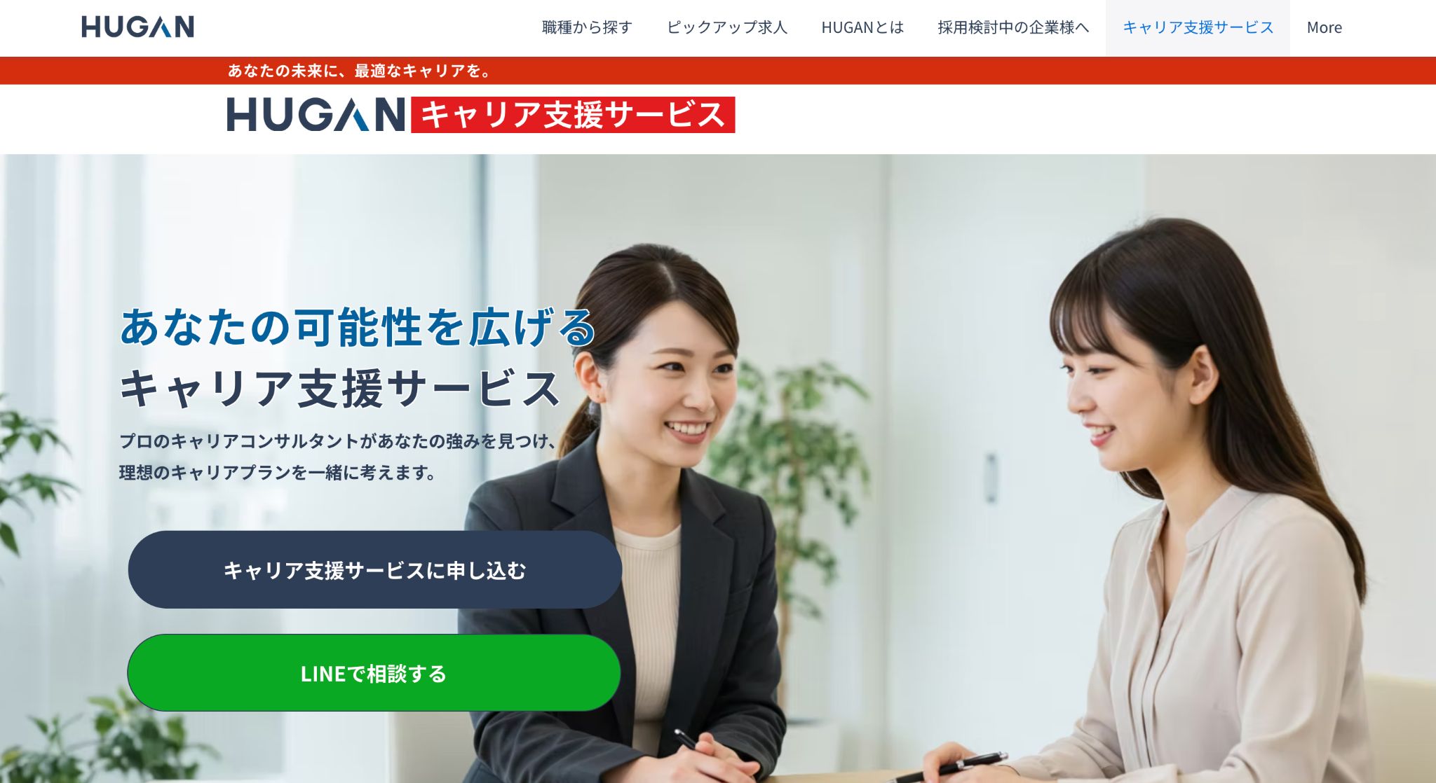 そこで、あわせて活用したいのが「HUGANのキャリア支援サービス」です。「HUGANのキャリア支援サービス」では、専任のキャリアコンサルタントが1対1で丁寧に話を聞いてくれて、今の悩みや将来の希望を踏まえながら、「自分は何を大事にして働きたいのか」「どんな仕事に向いているのか」を一緒に言語化していってくれるんですよ。これがすごいです。