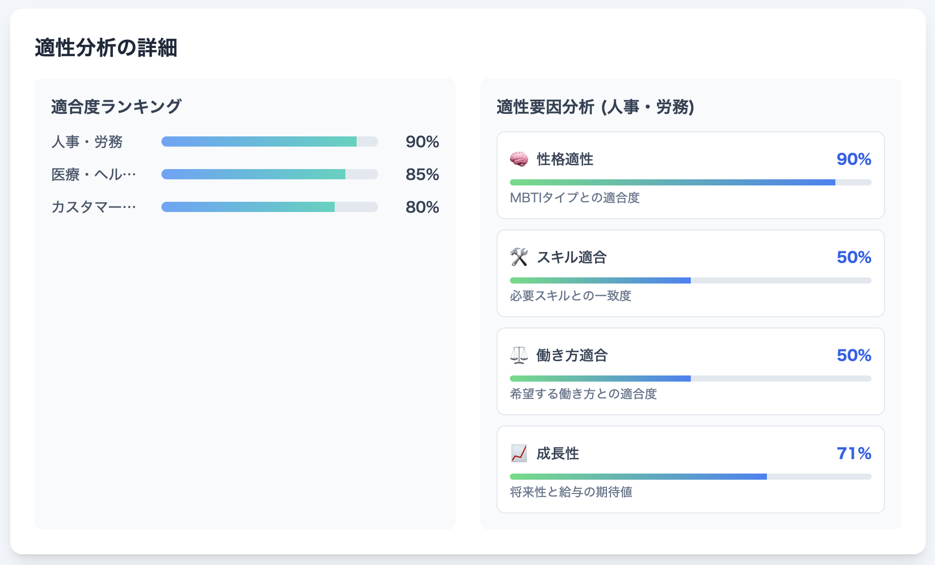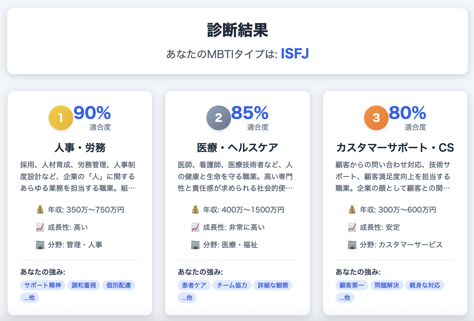私が診断を受けたときには「ISFJ(擁護者)」というタイプと判定され、「人事・労務」「医療・ヘルスケア」「カスタマーサポート」が適職として紹介されました。このように、それぞれに適合度(%)・平均年収・将来性まで記載されており、「この仕事は自分に合っていて、実際に安定したキャリアになりそうだ」と納得感のある情報が得られます。